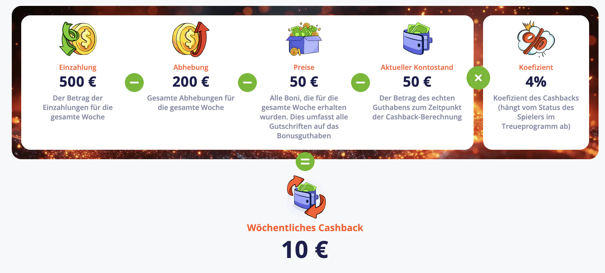| Bonusbetrag | Bis zu 4 % des wöchentlichen Nettoverlusts (abhängig vom Treuestatus) |