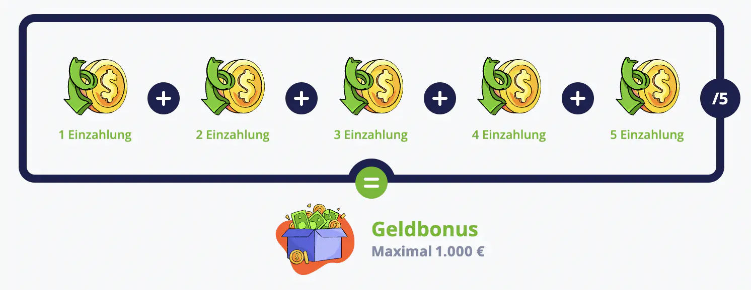 | Bonusbetrag | Bis zu 1.000 € Bonus – abhängig von der Höhe der fünf Einzahlungen während des Samstags. |